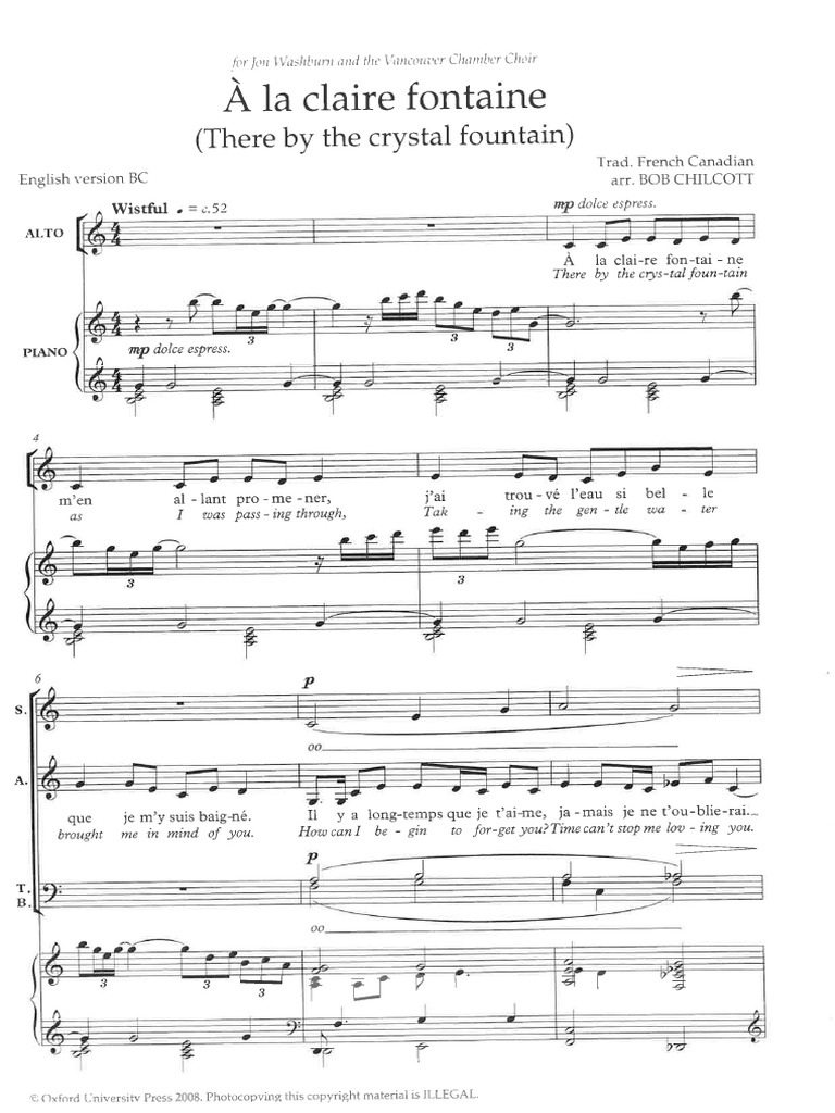 Title: À la claire Fontaine. Composer: Anonymous (Traditional) Number of voices: 4vv Voicing: SATB. Genre: Secular , Chanson. Language: French. Instruments: A cappella. First published: Description: Though the words are romantic, this song is above all a very well known nursery rhyme, at the same level as Frère Jacques or Au clair de la lune.