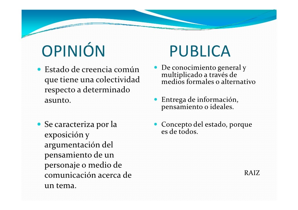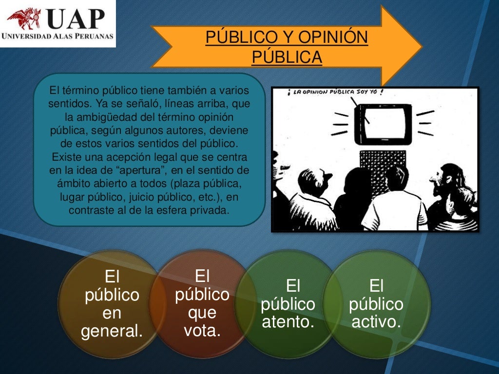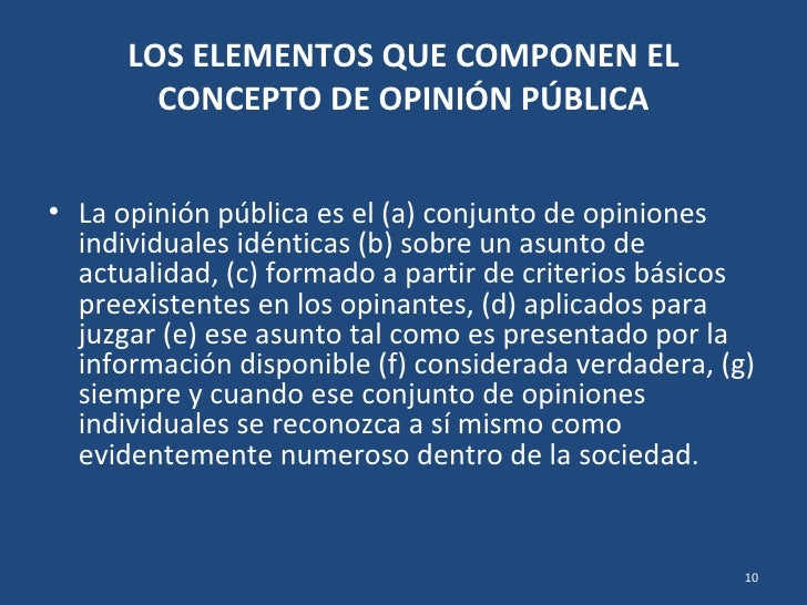 Comunicación y Opinión Pública. A Universidad Autónoma de Nuevo León, Monterrey, México (carlos.munizm@uanl.mx). La opinión pública se ha conceptualizado tradicionalmente como la suma o el agregado de las opiniones individuales, las que son mantenidas por los ciudadanos acerca de los asun tos o temáticas que se presentan en la esfera.