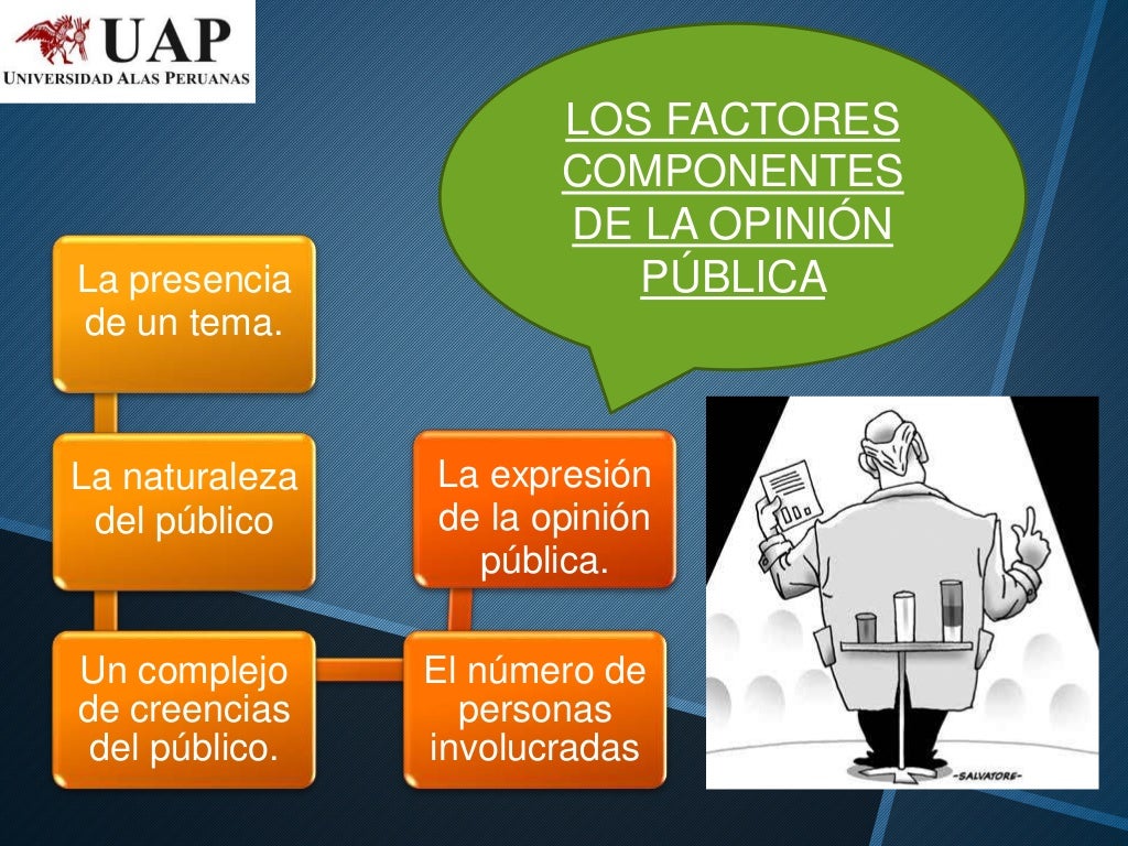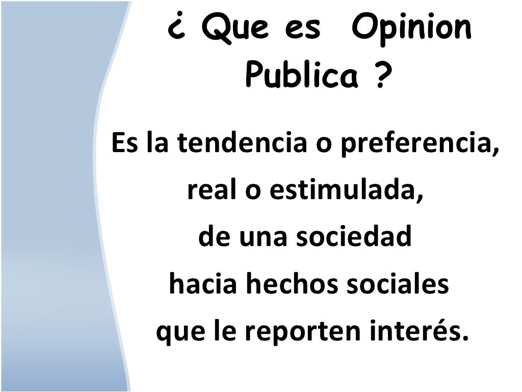 A grandes rasgos, la opinión pública se caracteriza por: Consiste en la sumatoria de las posturas de la sociedad frente a un tema de interés, especialmente cuando existe una postura mayoritaria o dominante. Es cambiante y susceptible de ser influenciada por los eventos ocurridos y las informaciones expresadas en los medios de comunicación.
