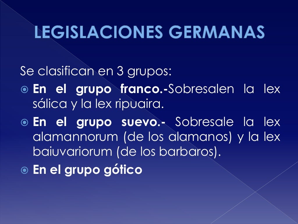 Historia del derecho 86 nombre de leges romanae barbarorum o códigos romano-bárbaros o romano- germánicos. Dentro de estas codificaciones, a través de las cuales sobrevivió el derecho romano en Occidente, las más importantes fueron: a) la Lex roma- na visigothorum, conocida como Breviario de Alarico; b) la Lex Romana burgun- diorum, también llamada Liber Papiensis y; c) el Edicto de.