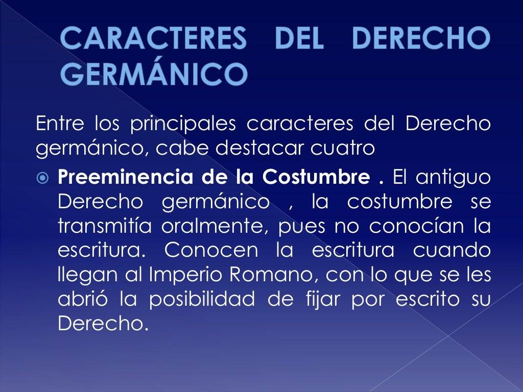 El documento describe el derecho germánico, un conjunto de normas que regían a los pueblos germánicos que invadieron el Imperio Romano. Se regían principalmente por el derecho consuetudinario y algunos códigos promulgados por reyes como el Código de Eurico en el 480 d.C. El derecho germánico era más primitivo que el derecho romano y tenía una idea más restringida de la propiedad.