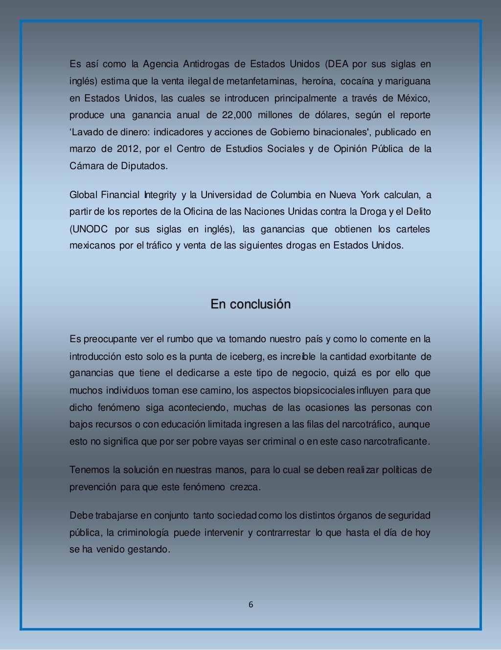 Conclusión. En la conclusión de este proyecto de investigación se hablará en general de todo lo escrito y desarrollado a lo largo de él. El narcotráfico se ha convertido en un problema sumamente delicado que debemos conocer, ya que nuestro país siempre ha sido uno de paso para las drogas hacia los Estados Unidos; también nos hemos.