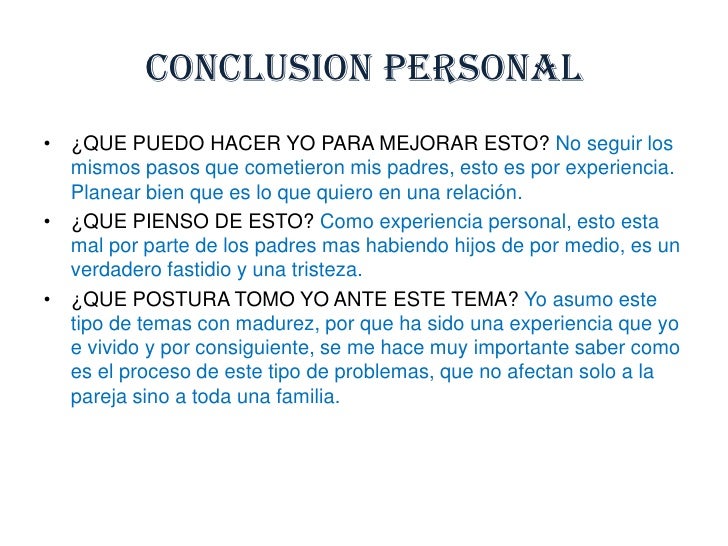 CONCLUSION DEL DIVORCIO. Enviado por EVA_09 • 9 de Octubre de 2014 • 291 Palabras (2 Páginas) • 11.482 Visitas. Página 1 de 2. CONCLUSION. 1..Este tema habla sobre las personas más afectadas en el acto de divorcio, estos son los hijos, ya que sufren en el aspecto de recibir menos cuidados al estar sus padres separados.
