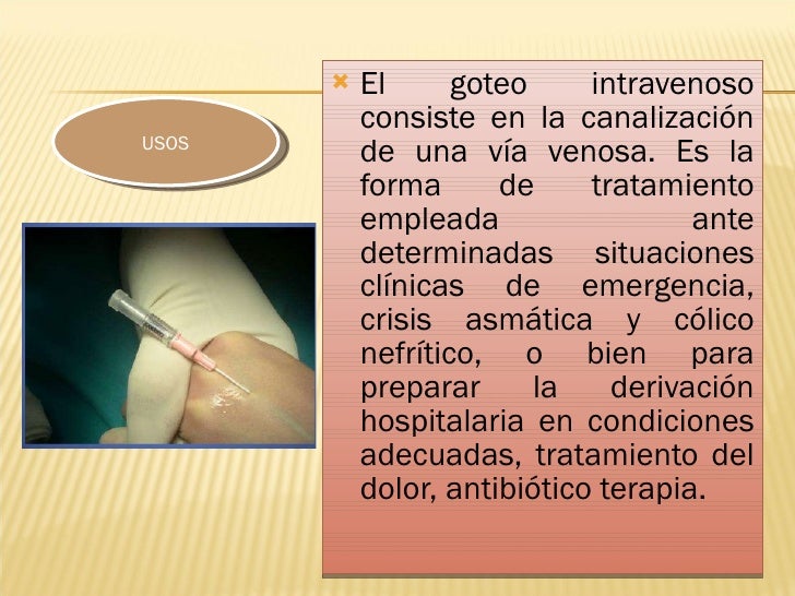 La terapia endovenosa incluye entre otros, los procedimientos de instalación, manejo y retiro del catéter, procedimientos que el personal de enfermería realiza de manera frecuente en las instituciones de salud. Las técnicas y los cuidados de enfermería, que estos procedimientos requieren, pueden ser consultados en el manual de enfermería.