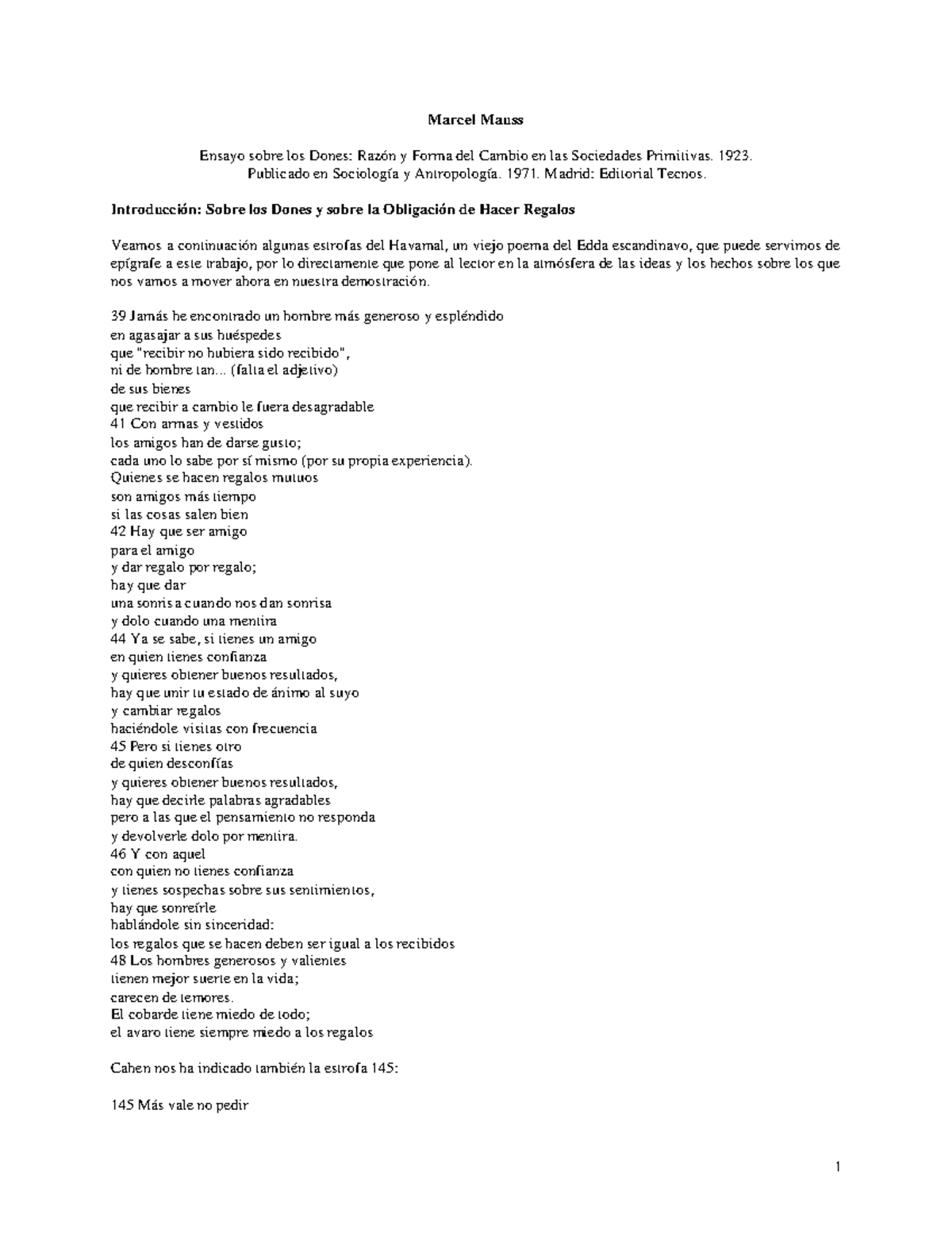 Ensayo sobre el don: Forma y función del intercambioen las sociedades arcaicas. Marcel, Mauss. Katz Editores, Jan 1, 2009 - Social Science - 271 pages.. En efecto, fue la introducción que éste preparó en 1950 para un volumen de Marcel Mauss que incluía el Ensayo.' lo que propició que la obra comenzara a ser reconocida como una de las.
