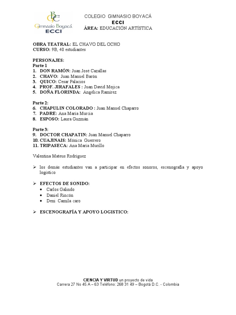 Download & View Libreto El Chavo Del Ochoas PDF for free. More details. Words:1,777. Pages:6. Preview. Full text. COLEGIO GIMNASIO BOYACÁ ECCI ÁREA: EDUCACIÓN ARTÍSTICA OBRA TEATRAL: EL CHAVO DEL OCHO CURSO: 9B, 40 estudiantes PERSONAJES: Parte 1 1. DON RAMÓN: Juan José Cazallas 2. CHAVO: Juan Manuel Barón 3.