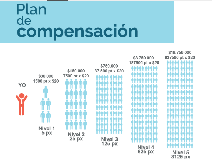El plan de compensación de MLM es una estructura que describe la estructura de pago dentro de la organización. Describe cómo los distribuidores en una compañía de mercadeo en red son recompensados por sus esfuerzos individuales y trabajo en equipo.