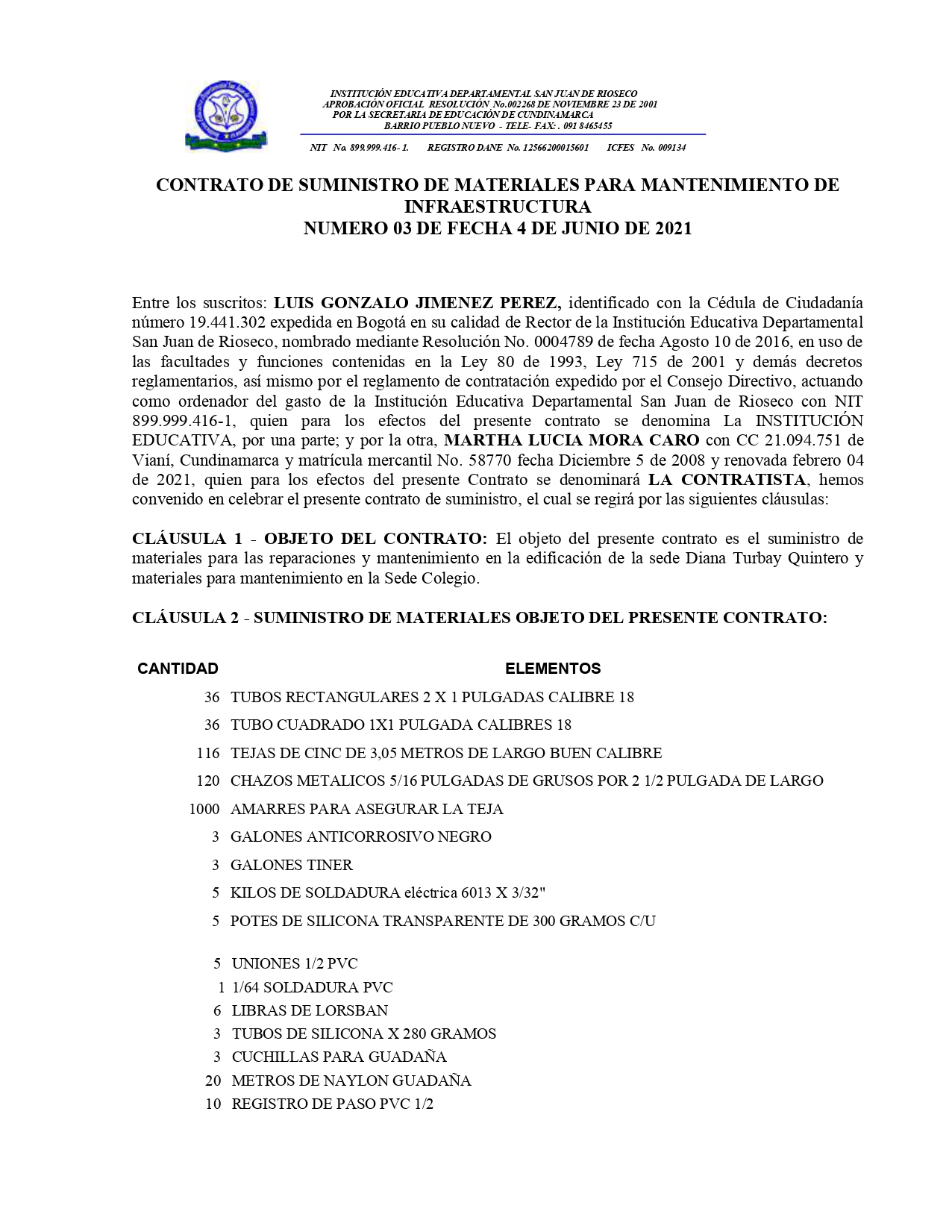 INSTITUCION EDUCATIVA DEPARTAMENTAL SAN JUAN DE RIOSECO CONTRATO DE SUMINISTRO DE MATERIALES