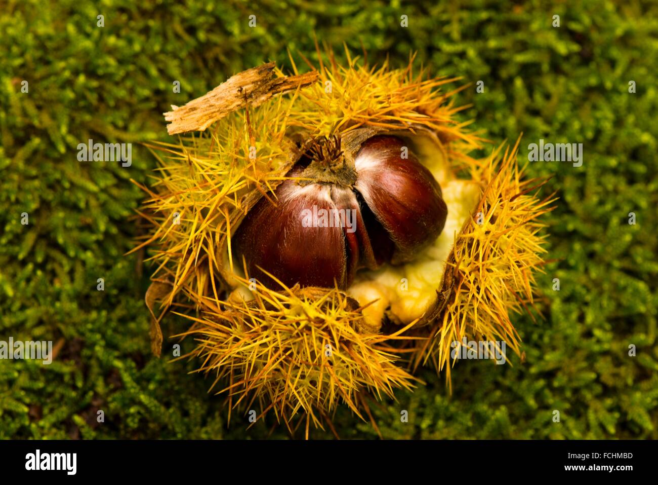La castaña fruto del castaño Castanea sativa, en su cápsula subglobosa muy espinosa llamada