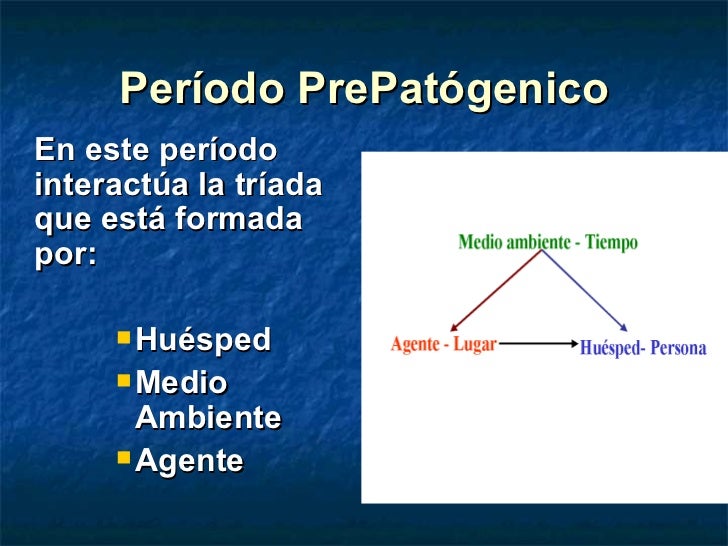 ¿Cuáles son los componentes del periodo Patogenico? Como se señaló, el período pre-patogénico se caracteriza porque entran en juego tres elementos fundamentales: el agente, el huésped y el medio ambiente, integrados en un proceso dinámico y continuo, denominado tríada ecológica, que pueden o no producir un estimulo de enfermedad.