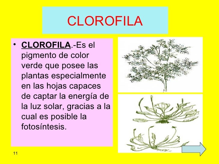La clorofila, es también llamada sangre de las plantas. Este es un químico que da el pigmento de color verde a las plantas, algas y bacterias. A través de ella se da la fotosíntesis en la vegetación y su tonalidad se produce porque las clorofilas absorben luz que se refleja luego en este tono. Es por esto que es necesario para las plantas.