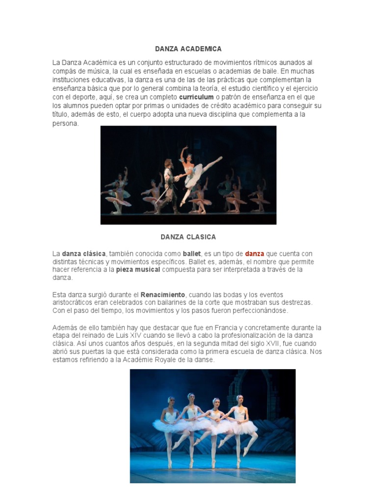 Existen varios tipos de danza académica, cada uno con su propio estilo y técnica. A continuación, se enumeran los principales tipos de danza académica: Ballet clásico. Danza contemporánea. Danza moderna.