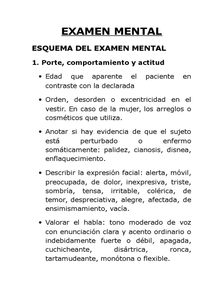 Estos son los 15 elementos a analizar para realizar un examen mental: 1. Aspecto físico. Poner atención a la postura, aseo personal, forma de vestir y constitución corporal. Si ya se lleva tiempo tratando al paciente, es importante anotar cambios que se observen desde la última sesión, ya que suelen relacionarse con la evolución del.